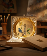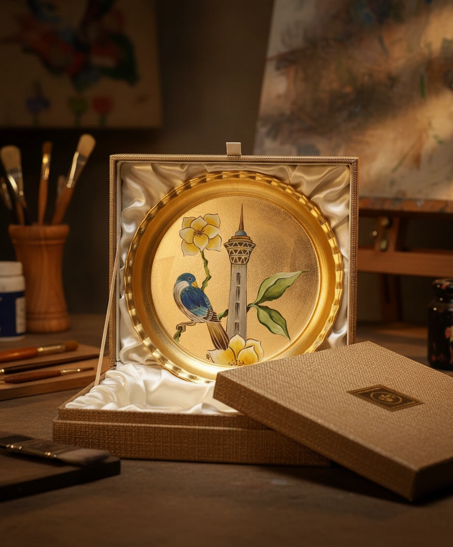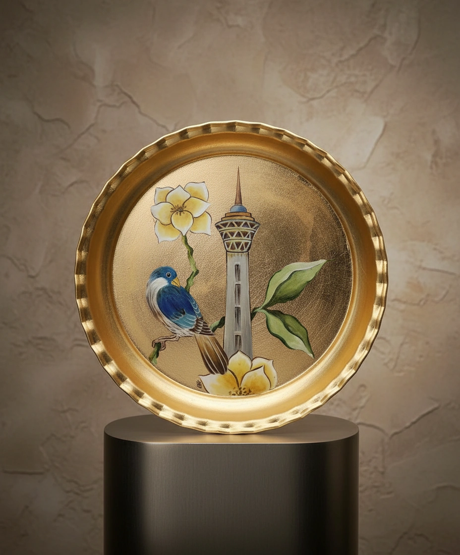 بشقاب دیوارکوب پتینه ورق طلا و نگارگری طرح برج میلاد
