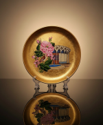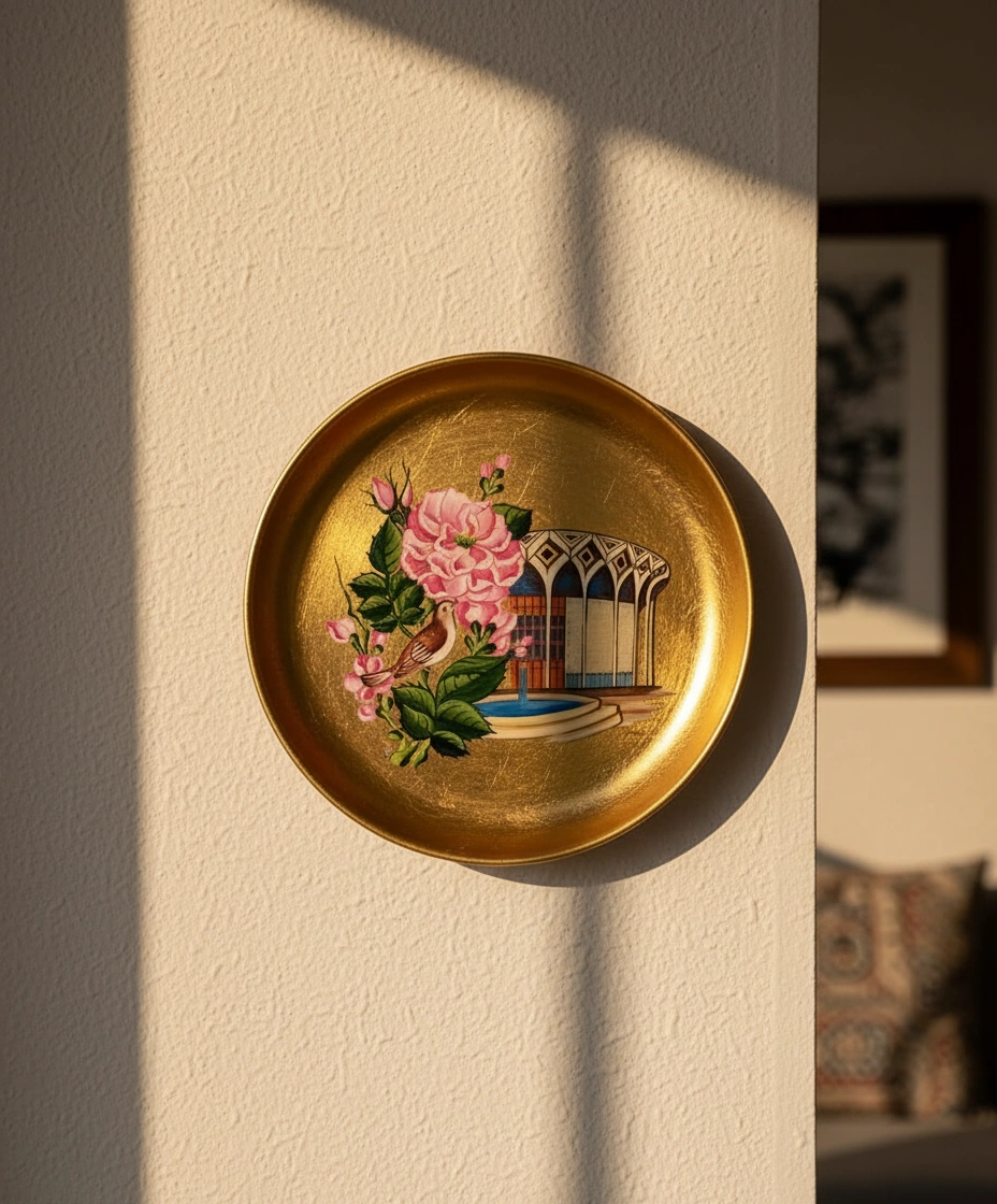 بشقاب دیوارکوب پتینه ورق طلا و نگارگری طرح سر در باغ ملی